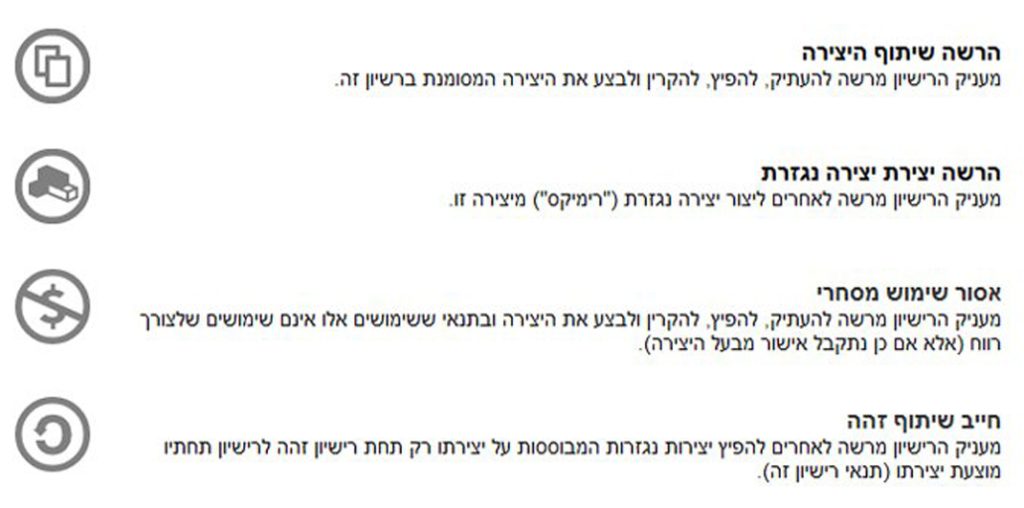 כל בעל יצירה יכול להחליט על מידת השימוש והשיתוף שהוא מאפשר לאנשים. לכל סוג הרשאה יש סמל יעודי. על היוצר לסמן את עבודתו בסמלים הרלוונטיים כגון: