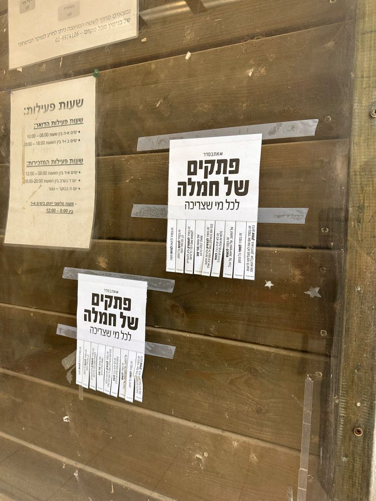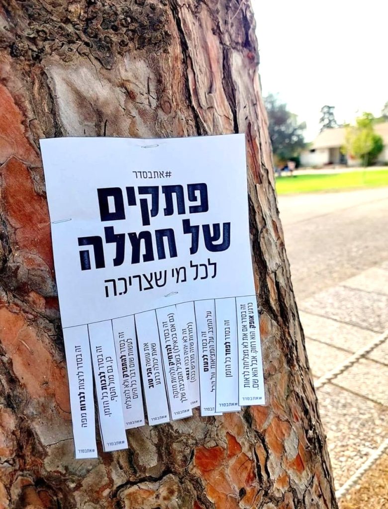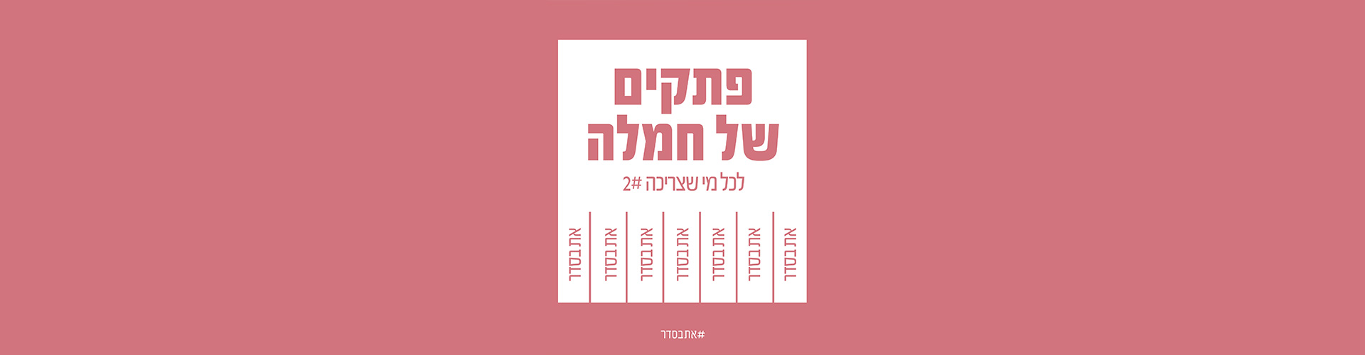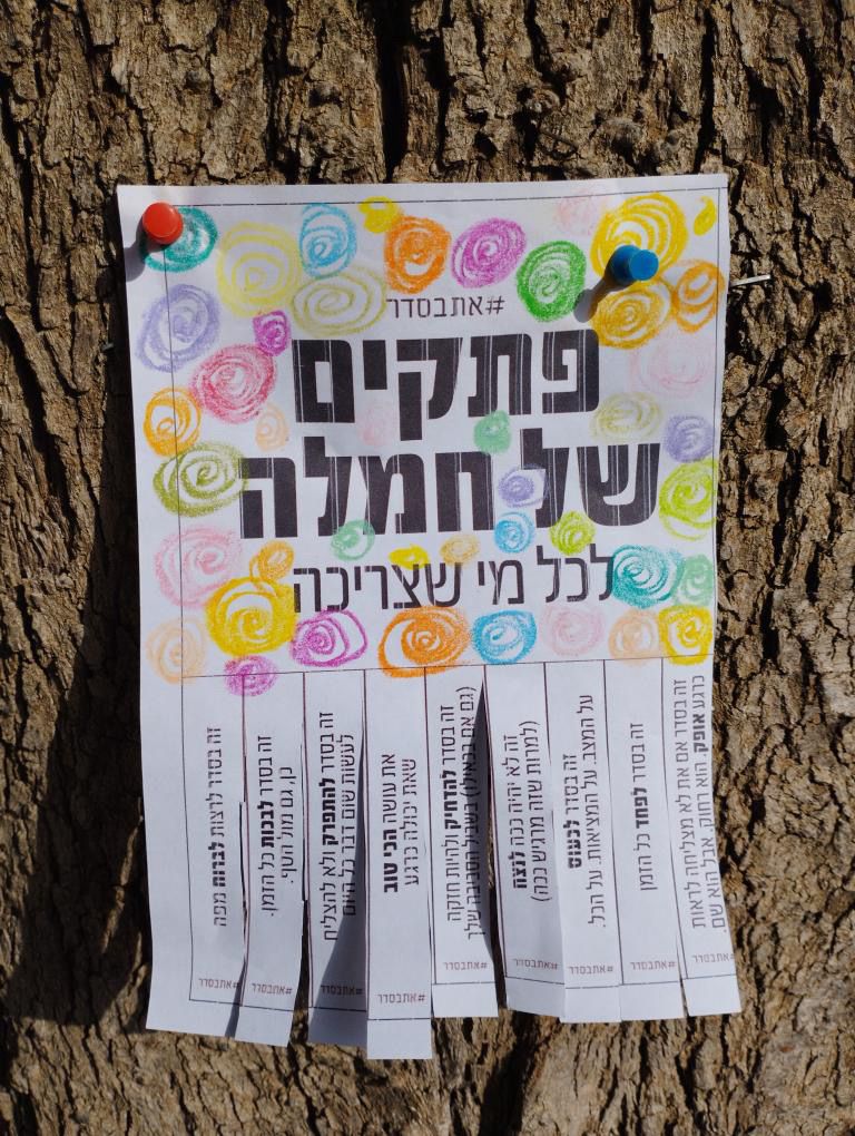 הייתי זקוקה נואשות לאיזו נקודה של אור בתוך החושך, שמישהי תגיד לי שמה שאני חווה הוא נורמלי בתוך כל הלא נורמלי, ונזכרתי בפתקים של חמלה שכתבתי עוד בקורונה. אז החלטתי לייצר גרסה נוספת למלחמה – פתקים של חמלה לכל מי שצריכה. הדימוי שבחרתי לפוסט הוא של הפתקים של פעם שהיה אפשר לתלוש. בלילה שאלה אחת העוקבות אם אפשר להדפיס ולחלק לנשים אהובות כדי להציע להן מעט חמלה מחזקת. ישר נדלקה לי נורה בראש! ומשם הפוסט הפך לשלט כמו של פעם. כל אחת יכולה להדפיס בבית, לתלות במרחב הציבורי ולפזר חמלה למי שזקוקה. הפשטות של הרעיון היא לגמרי החוזק שלו. השלטים נתלו בכל מקום בארץ, בגינות שעשועים, בכניסות לבניינים, בבתי חולים, בבתי ספר, סתם ככה על ספסלים ברחוב, מועצות אזוריות וארגונים ביקשו אישור להוסיף את הלוגו שלהן ולהפיץ, ואני לא מפסיקה לקבל תמונות והודעות ותיוגים. זה כל כך מרגש. והתוצאה – מאות אלפי פתקים קטנים, עם מילים של חמלה, המחכים ליד התולשת שזקוקה להן.