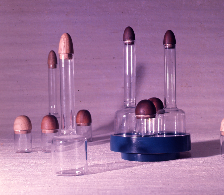 תמר דה-שליט, אהרון גלס, מיכאל מאיר ("עיצוב ותכנון"). ערכת כלים לתבלינים, אמצע שנות ה-60. אוסף גולדרייך–דה-שליט, ארכיון אדריכלות ישראל