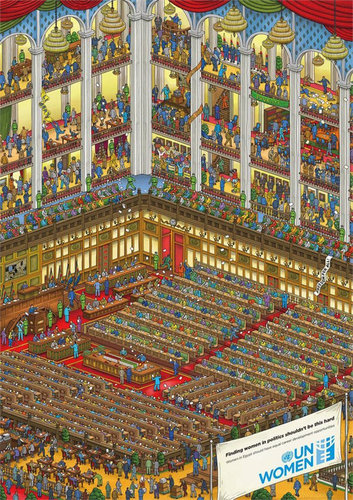 הפרויקט ברבור שחור – סירת הצלה אמנם מפעיל את הדמיון, אך מותיר את המבקרים פסיביים. לעומתו, הפרויקט למצוא אותה, של סטודיו IC4Design (הירופומי קמיגאקי ודאייסוקה מטסובארה), שואף להוציא את המבקרים מפוזיציית הצופה הסביל. למצוא אותה הוא קמפיין המורכב מסדרה של שלוש פרסומות המתייחסות למיעוט הנשים בכוח העבודה המצרי. מי שמתבונן בפוסטר נדרש לאתר את האישה היחידה בכל אחד ממקומות העבודה המופיעים באיורים. במקרה זה הפורמט המשחקי משמש ככלי להפעלת הצופה ולהפיכתו לשותף אקטיבי. ההפעלה של הצופה עולה בקנה אחד גם עם המסר שמבקש הקמפיין להעביר. הקריאה להתגייסות אקטיבית של הממשלות כדי להתגבר על המכשולים שמונעים מנשים ומנערות להגשים את מלוא הפוטנציאל שלהן.