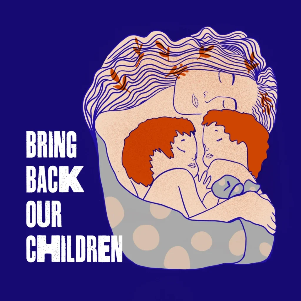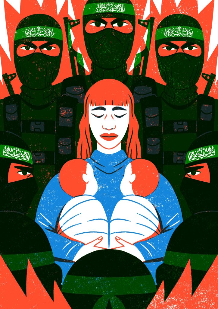 "הדימוי הראשון שיצרתי הוא הומאז' ליצירה של קלימט Three Ages of Woman. זאת יצירה שמרגשת אותי במיוחד מאז שהפכתי לאמא, והיא מרגישה לי כל כך מדויקת בהקשר של אימהות והורות. בשבת השחורה ההיא בערב ראיתי את הוידאו של האמא עם שני הילדים הקטנים שלה, בתוך השמיכה. הווידאו הזה שבר אותי. עוד לא הבנתי בכלל את מימדי האסון. אבל מה שכן הבנתי זה שיש אמא ושני תינוקות חטופים בעזה. מיד חשבתי על הציור של קלימט ועל זה שבתוך כל הסבל הזה היא עדיין האמא המגנה, השומרת, שעוטפת אותם ומחזיקה חזק. יותר מאוחר גיליתי שהאמא היא שירי ביבס והילדים הם אריאל בן הארבע וכפיר שהוא בן תשעה חודשים. יש לי ילדים בגילאים מאוד קרובים וגם לילדה הבכורה שלי קוראים אריאל. זה הפך את הסיפור שלהם לקשה במיוחד, לדמיין אותם שם לבד, בלי לדעת אם יש מי שמטפל בהם בכלל, אמא עם תינוק קטן שעוד צריך בקבוק, חיתולים.