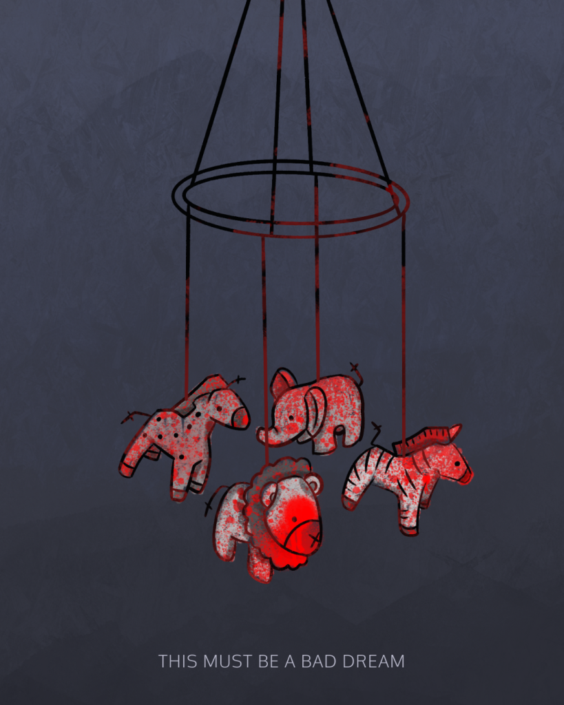 "חיכיתי לפרויקט מהסוג הזה. לא יכולתי להתרכז בעבודה הרגילה שלי, ורציתי להרגיש חלק מהמאמץ המלחמתי. רציתי להרגיש שאני עושה משהו שיש לו משמעות. בתחילת המלחמה פחדתי להיות בחוץ וקיוויתי שתהיה יוזמה שבה אני אוכל להרגיש שאני תורמת גם בלי לצאת מהבית. כששמעתי על הפרויקט, יצרתי המון דימויים. בהתחלה ניסיתי לעצב דימויים ניטרליים ו'פוסטריים' ולא הרשתי לעצמי להביע רגש, אבל ככל שהמלחמה המשיכה ונחשפתי לאימג׳ים ולסרטוני הסברה אחרים, הבנתי שהרגש הוא מרכיב מאוד חזק בהסברה שלנו. הרשיתי לעצמי 'לחפור' יותר לעומק במה שאני מרגישה וכך יצרתי את הדימוי של המובייל עם השפרצות הדם: מכל הזוועות שקרו ב-7 לאוקטובר הדבר שהכי זיעזע אותי היה הרצח של התינוקות. רציתי לייצר דימוי שמדבר על זה בלי להיות מילולי מדי וככה חשבתי על הדימוי של המובייל. חפץ כל כך תמים שנחשף לטבח נורא".