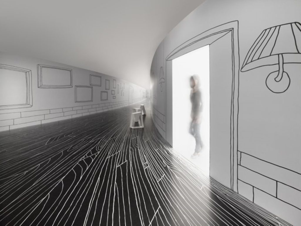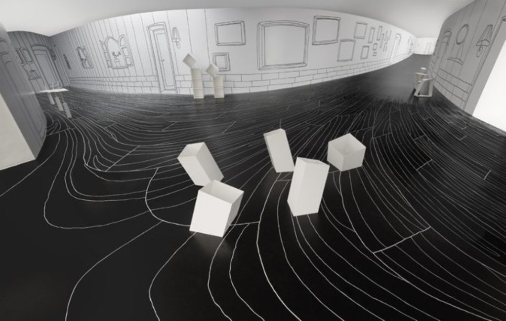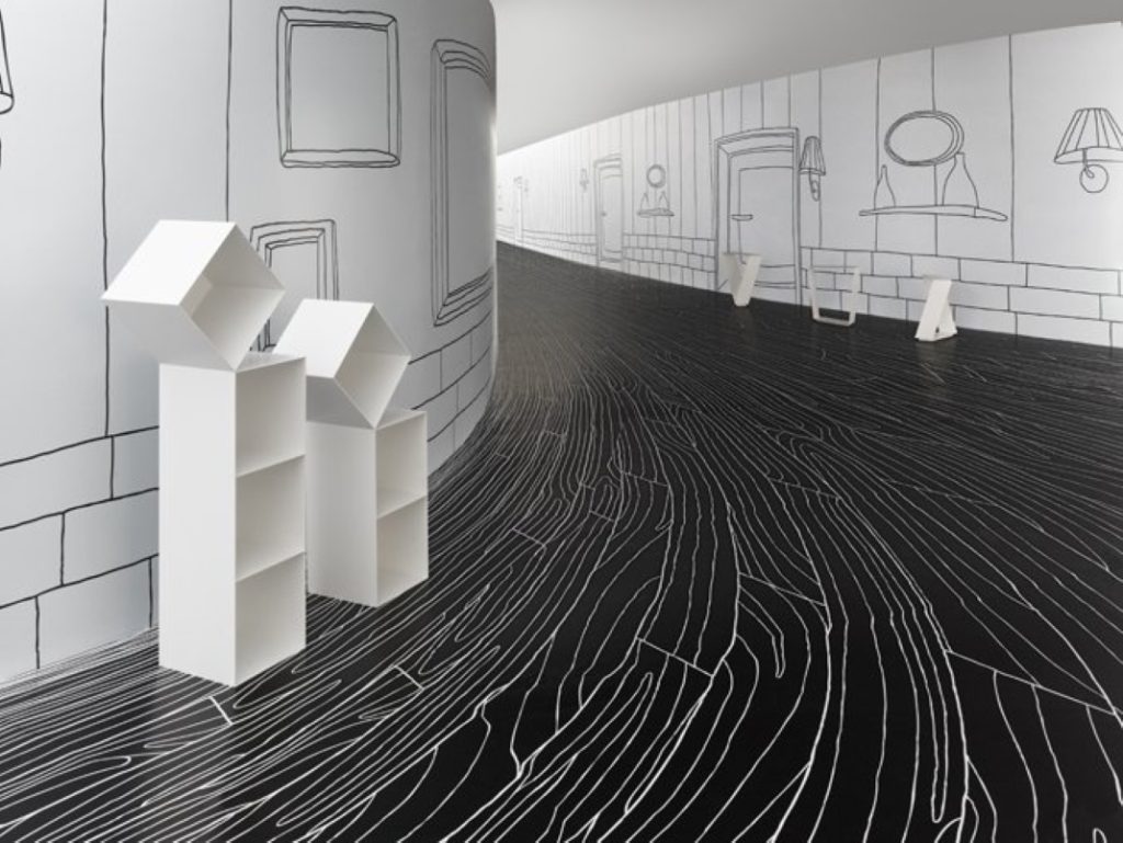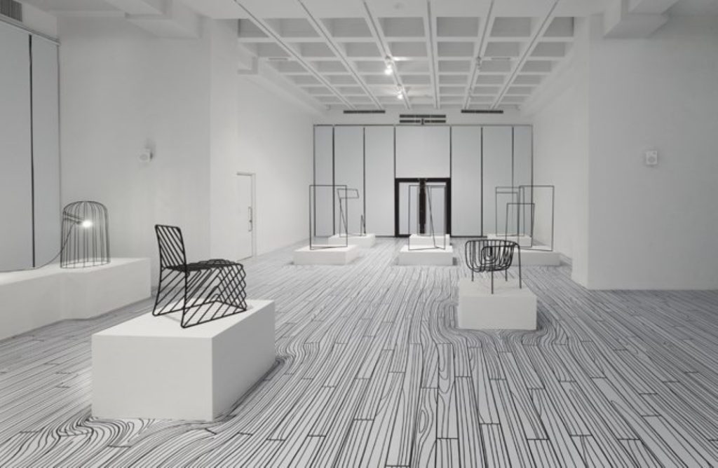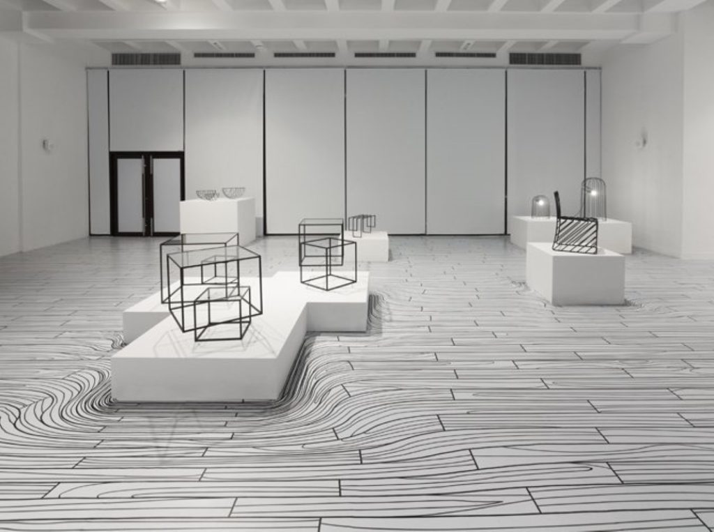 הקולקציה "קווים שחורים דקים" היא קולקציה של רהיטים שנוצרו מתוך "קו שחור בודד ושקט", מספרים חברי ננדו ומבהירים שבעקבות זה, החליטו להשתמש בעיצוב התערוכה דווקא בשחור "אקטיבי" על גבי הלבן. על הרצפה הלבנה ציירו המעצבים קווים שחורים מתעקלים הנראים לפעמים כמו שרטוט פרקט עץ גמיש ולפעמים כמו נהר קווי. קווים אלה סובבים את המוצגים וגורמים לאשליה של גובה, עומק וזרימה בחלל הסטטי והדומם. לעומת אלה, הקולקציה "ריבועים רוקדים" התבססה על עיקרון "לבן אקטיבי". כאן, מספרים חברי ננדו, הם החליטו לעצב את חלל התצוגה דווקא לפי הרעיון "שחור דומם על לבן". בחללים אלה שרטטו המעצבים על הקירות בקווים שחורים פשוטים, חללים דמויי גלריה, סלון או בית אך עיוותו אותם כך שיידמו לחלל הנראה דרך טיפת מים.