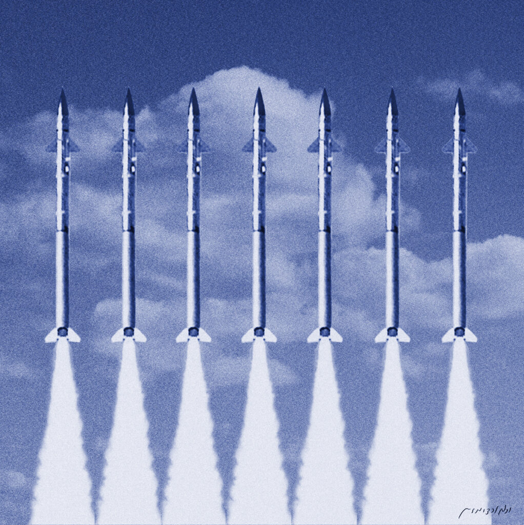 במקביל, מעצבים עכשוויים בוחנים מחדש את סמליותו של הכחול, מעניקים לו פרשנויות חדשות ומגיבים למציאות המקומית המורכבת. כך משקף הכחול את השינויים התרבותיים, הפוליטיים והרגשיים של החברה הישראלית. בכרזת "שבעה קנים למנורה" של ירום ורדימון [6], מנורת השלום מיוצגת על ידי של שבעה טילים המזכירים טילי מערכות הגנה אוויריות, והכחול של רקע המנורה הופך לשמי מלחמה כהים ומפוארים. בעבודתה של ענת גולן, "מחרוזת אבלות" [7], הכחול המוכר של נר הזיכרון היהודי מומר למחרוזת המאזכרת קמעות ים־תיכוניים, כפרשנות חדשה למנהגי אבל וזיכרון במציאות המקומית.