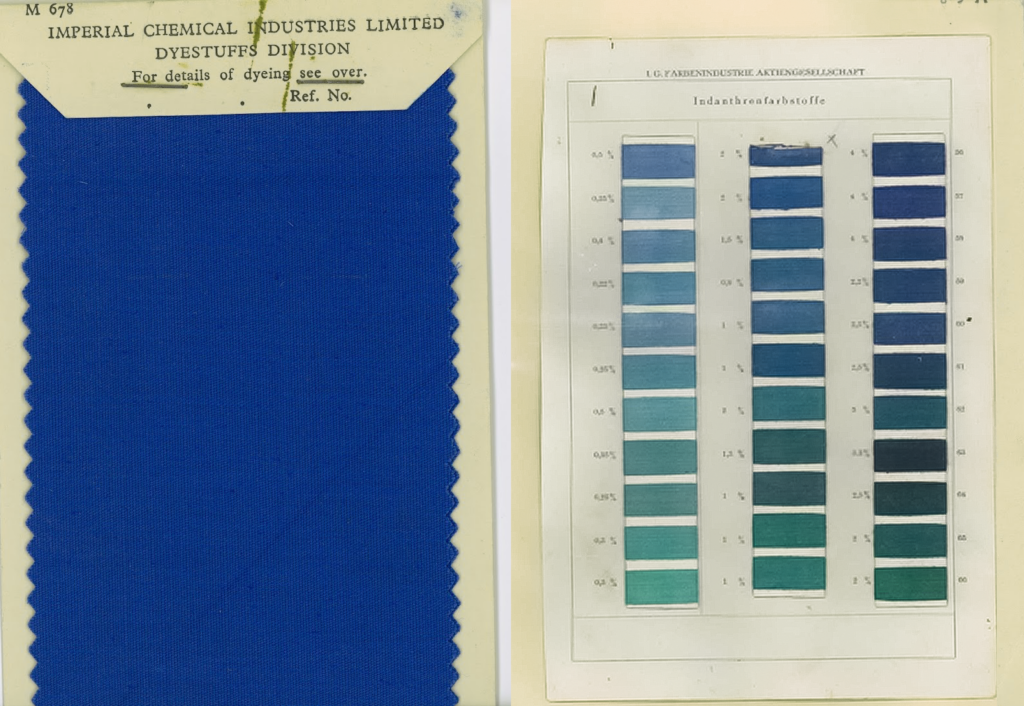 [1] מסמכי הועדת המשנה לבחירת טיב הדגל. משמאל: הצעות לגוון הצבע הכחול של הדגל, 1948. מימין: הגוון הנבחר, 1950 (מתוך ארכיון המדינה)