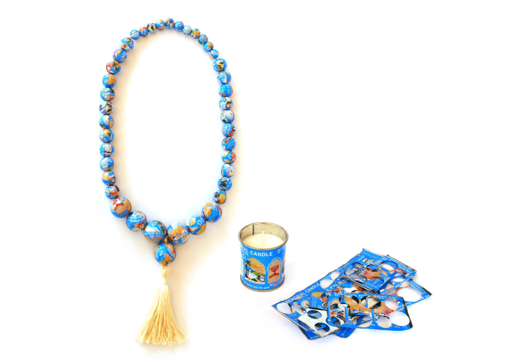 מלמעלה למטה: [6] ירום ורדימון, כרזת שבעה קנים למנורה, 2018, מתוך אוסף מרכז שנקר לחקר העיצוב בישראל; [7] ענת גולן, מחרוזת אבלות, 2017, מתוך אוסף מרכז שנקר לחקר העיצוב בישראל.