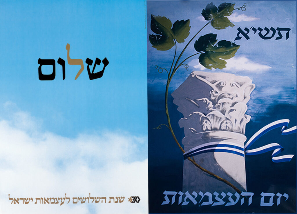 מימין לשמאל: [4] רודולף סידנר, שלוש שנים למדינת ישראל, 1951, כרזה (מתוך ויקיפדיה); [5] דוד טרטקובר, כרזת יום העצמאות ה־30, 1977, מתוך אוסף מרכז שנקר לחקר העיצוב בישראל.