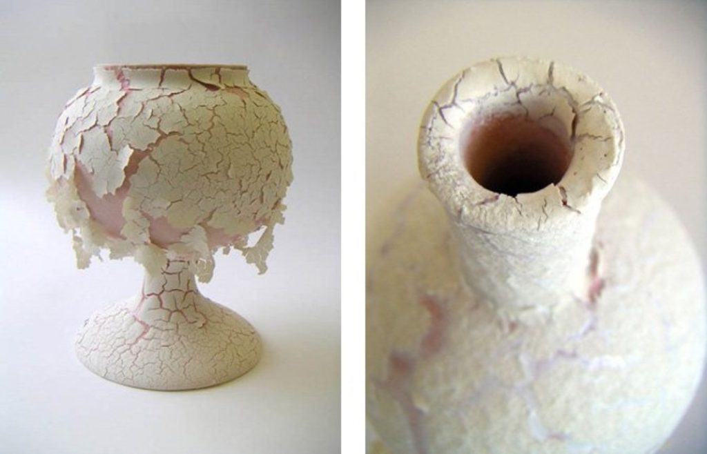 "במציאות העור ממשיך להתקלף, בין אם אתה נוגע בו או לא, בכלים הפיסות ימשיכו ליפול רק אם תיגע בהם. כל אובייקט עובר תהליך שונה. אני מכינה את האובייקט מחומר יציקה ומכניסה לשריפה ראשונה בתנור, אחר כך אני שמה גלזורה ושריפה שנייה. אני משמנת את הכלי ואז מרססת חומר יציקה. בגלל שחומר היציקה החדש מתכווץ באחוז שונה מהחומר שכבר עבר שריפה נוצרים הסדקים. בנוסף השמן גורם לכך שהחומר לא יידבק במאה אחוז לכלי הקיים ואז נוצר מראה השכבות. אז אני מחליטה אם המראה מתאים למה שאני רוצה או לא. אם אני רוצה להמשיך אני מקלפת את החומר החדש ששמתי בספריי לפני שאני מכניסה לתנור ועושה שוב את אותו תהליך. בכל שלב בתהליך אם החלטתי להשאיר או לקלף חלק מהחומר תמיד נשארת שכבה דקה על האגרטל שמציגה וממחישה עוד יותר את מראה השכבות. אפשר לחזור על התהליך כמה פעמים שרוצים".
