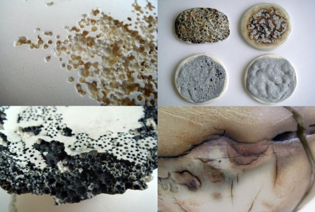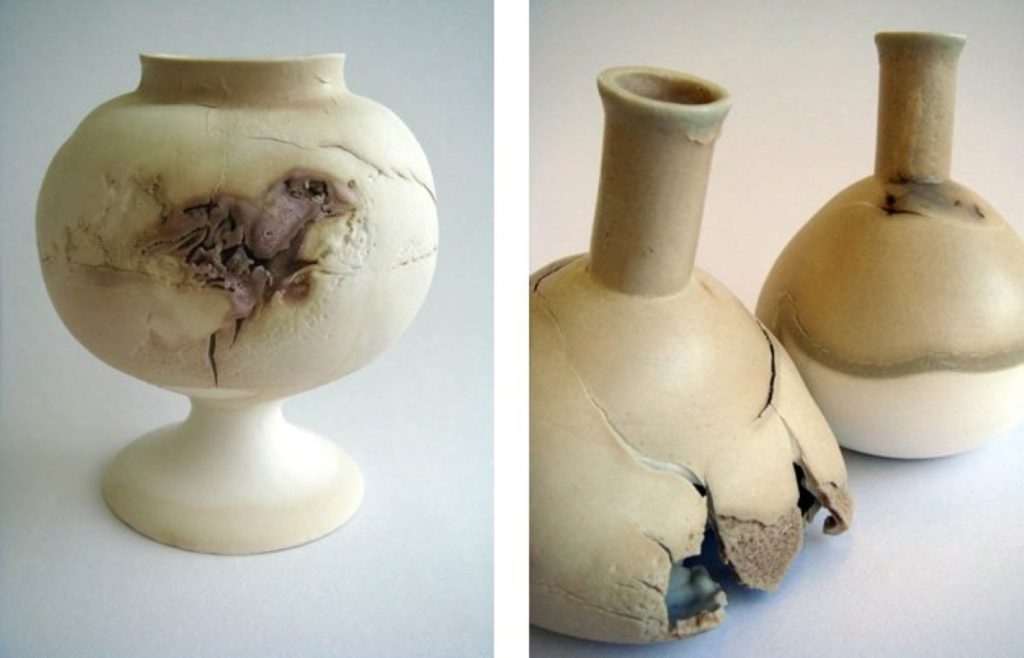 "גם וגם. בחלק מהאובייקטים היה לי רעיון ראשוני מה יקרה אם. לדוגמא: כדי ליצור את מראה האקנה עשיתי ניסיונות עם הגלזורה וניסיתי לשלוט בה כך שתראה כמו חצ'קונים. דוגמא נוספת היא מחלת האוסטופורזיס (דלדול עצם) שבה הדחיסות בעצם פוחתת ונוצרים חורים. במקרה הזה השתמשתי בשמרים כי זה משפיע על הצפיפות של החומר. במקרים אלה יכולתי לצפות את התוצאה, אבל באחרים עשיתי ניסיונות ואז חיפשתי מחלות שיתאימו למה שיצא. לקחתי חלק מהצנצנות האלה לרופא שינסה להגיד איזו מחלה מתאימה, איזו סימפטומים אפשר לראות על החולה ואפשר לראות גם על הצנצנות שלי. כדי שהאובייקטים יהיו חזקים בחרתי להשתמש במחלות ידועות, שרבים מכירים ויוכלו להזדהות איתם."