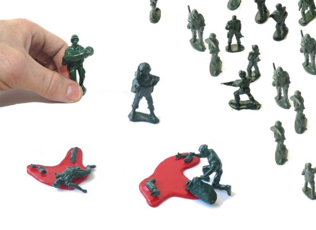 שחר קגן בדק פן אחר לחלוטין של היום יום. קבוצות חיילים מתהלכים עם נשקיהם הדרוכים ברחובות הוא מראה שיגרתי לחלוטין עבורנו הישראלים, ומראות של מיידי אבנים, הרוגי פיגועים וארונות קבורה הוא עניין כמעט יום יומי בעיתונים ובחדשות. קגן בחר ליצור חיילי צעצוע קטנים שיהוו תוספת ישראלית למשחק. בעבודתו, קיבלו חיילי הצעצוע אינטרפרטציות מצמררות כשלכל אחד מהם תפקיד מוכר וטרגי.