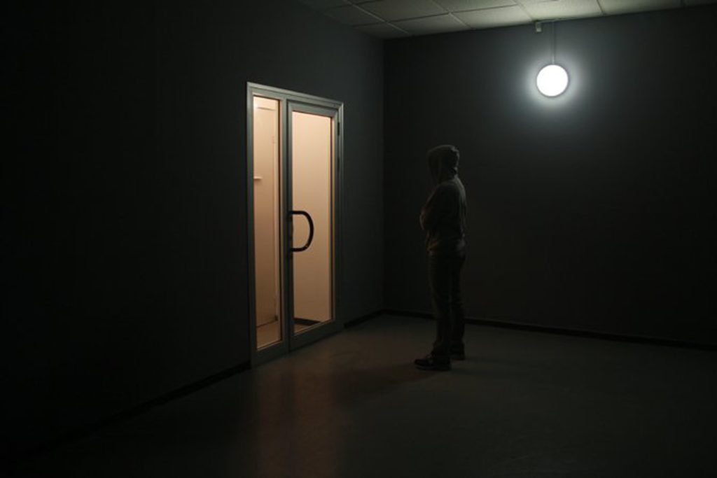 עבודה זו מוצבת מאחורי אחד הקירות המרוחקים באחד החללים בתערוכה. מאחורי פיתול בחדר נגלית דלת אלומיניום וזכוכית "עכשווית" מוארת מבפנים וחושפת מאחוריה דלת ברזל חסומה בשרשראות ומנעולים. לרגע נדמה שזו דלת אחורית במבנה, סתמית כמו דלתות של חנויות רבות, אך קול המוסיקה העזה, טראש מטאל, מאיימת כמעט לבקע את הדלת האטומה. דפיקות עזות נשמעות לפתע ומטלטלות את דלת הברזל והשלשלאות שעליה, נראה כאילו מישהו מנסה לפרוץ אותה ולחדור פנימה, אל החלל בו נמצאים המבקרים. באחת הופכת הדלת מכזו שמגנה עלינו מן העולם החיצון לכזו שמאיימת עלינו, באחת, מתחלף הרצון שלנו להביט אל מה שמעבר לדלת בניסיון להימלט מהקולות הנואשים שבחוץ המאיימים להציף אותנו.