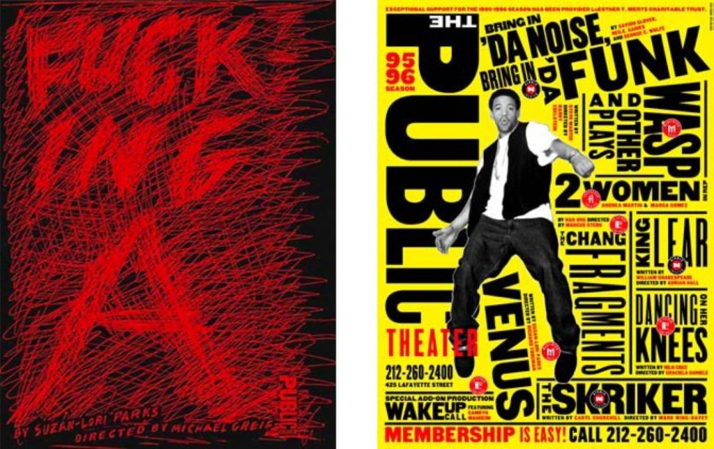 התאטרון הציבורי ניו יורק - הקופות מלוות בקולאז' של הכרזות שעוצבו על ידי שר לאורך השנים