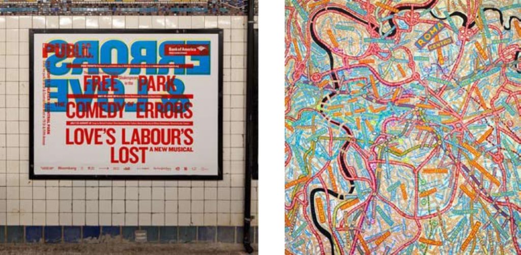 ימין: מפת רומא. שמאל: פוסטר לתאטרון הציבורי ניו יורק (Public Theatre NY)