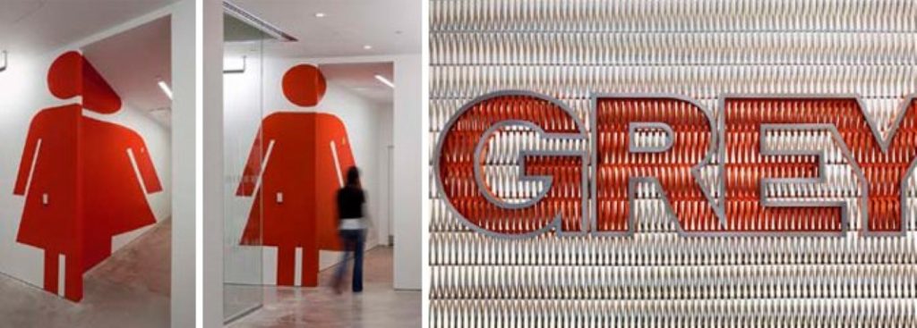 GREY GROUP – עיצוב סביבתי לחברת תקשורת שיווקית: השלט של לוגו החברה ועיצוב הפנים של המשרדים עשויים מאותם חומרים. שימוש באייקון השירותים בכניסה ובמסדרון.
