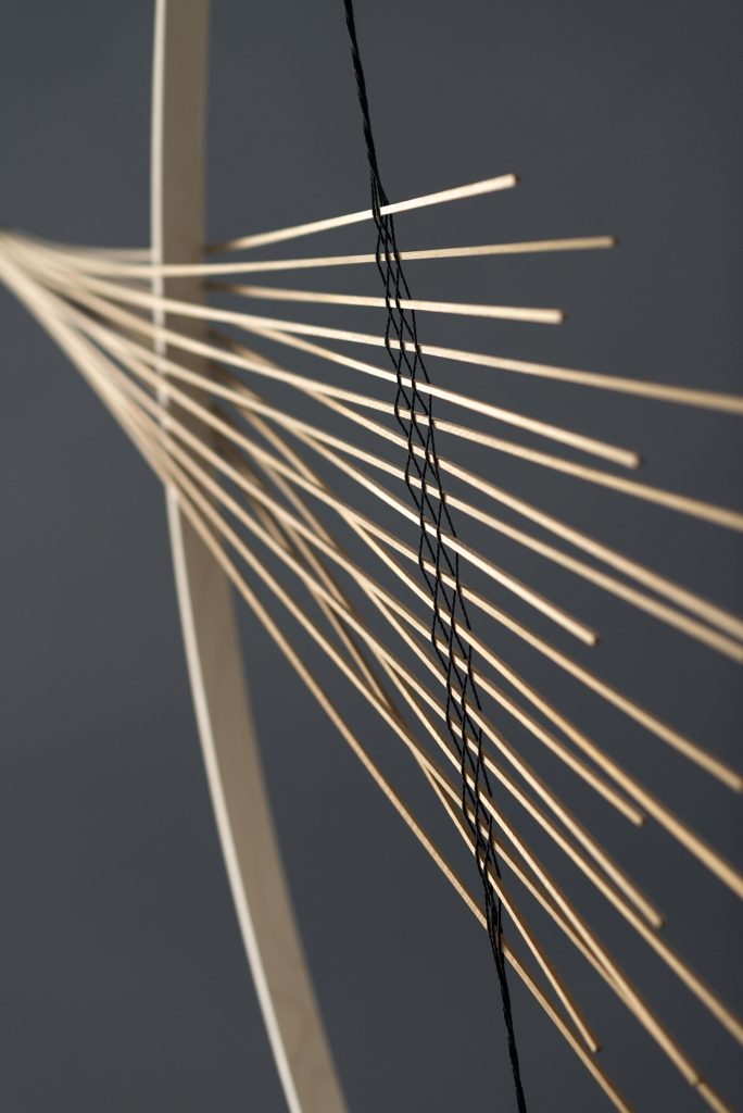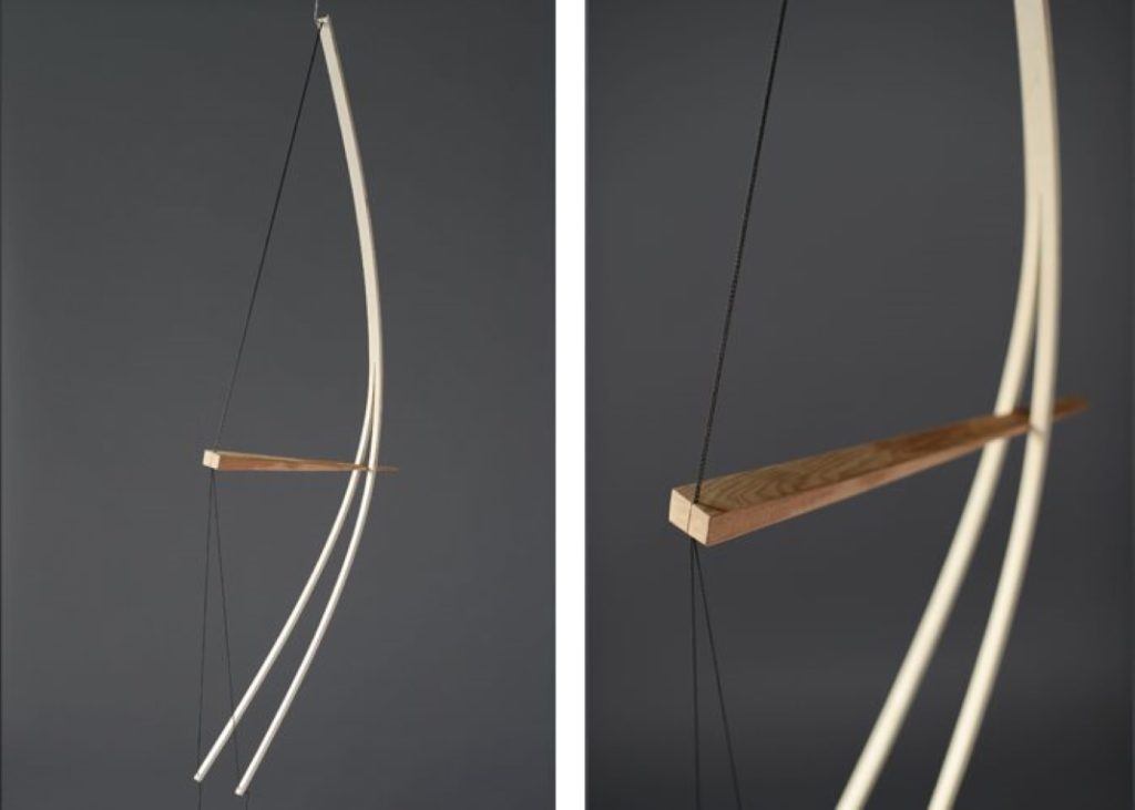 When we build a tent, for example, we fix it in place and stabilize it with tensed “strings” and stakes driven into the ground. Since the bow has a string as well as an element that increases the tension, I employed the same principle. Thus once again, a shape is formed that comes from another world of content. An additional example is posed by the traditional bow saw: to be able to cut, two strings create tension, while between the two is a small piece of wood as the stopper. I actually used the same method, and it’s possible to see this principle at work in one of the objects on display. These are two archetypes I tried to use, and you can see both objects simultaneously in the works.
