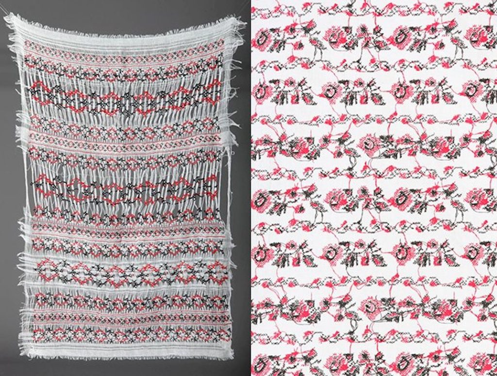 Textile Design 2010 | Yelena Trakhtenberg The second, Katja Zorin’s “Screens”, is a series of fabrics that constitute a kind of dream catcher. Hand embroidery on white cotton fabrics that dialogues with various cultures, including Ukrainian, Romanian, and even Bedouin embroidery. The fabrics evoke wonderment, and many questions along the lines of “how did she do that?”