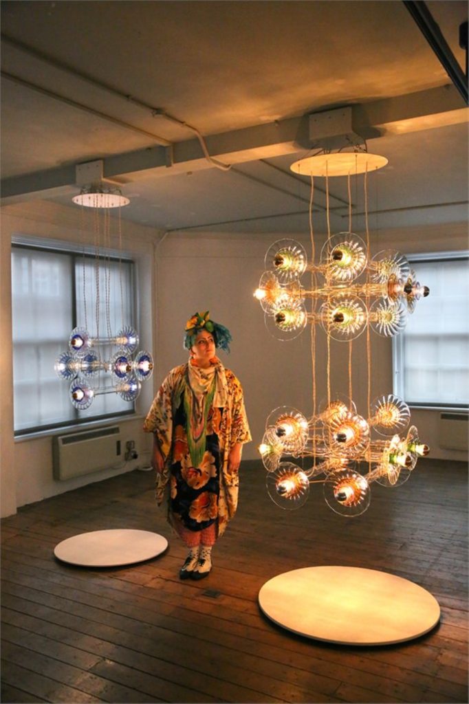 Another large-scale object is a chandelier by Canadian designer Omer Arbel, which cascades thirty meters down from the ceiling of the first floor through a hole in the floor to the ground floor.