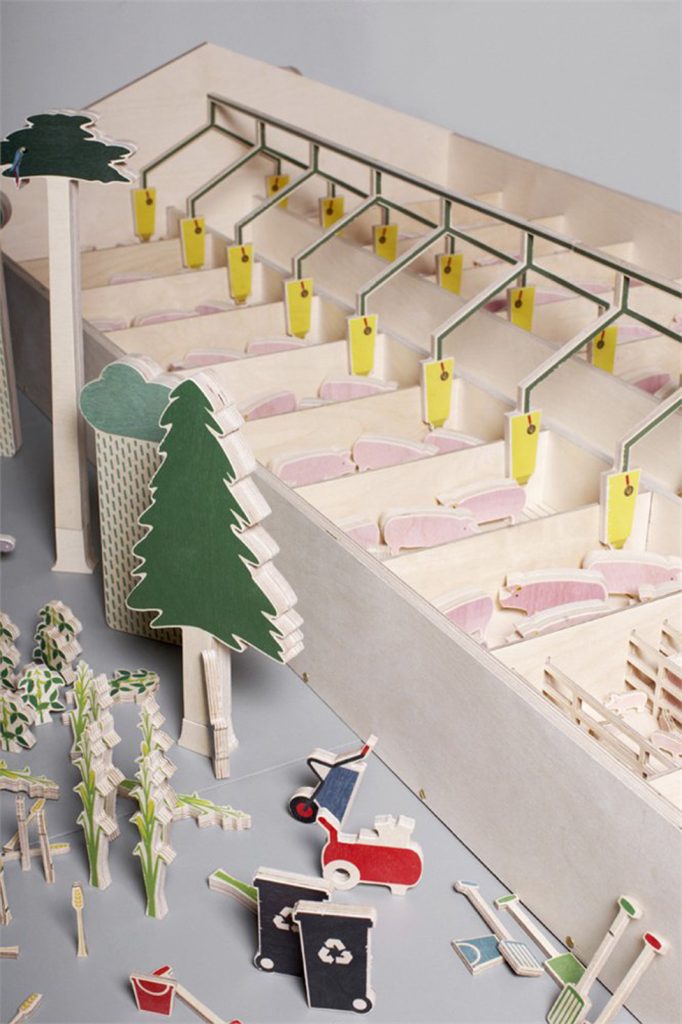Another issue that is preoccupying designers is heightening awareness to the food we eat and its origins. Playing Food is the name of a project that aims to foster a better understanding of where the food on our plates comes from. While many parents traditionally teach their children not to play with their food, here children are invited to play with the food they are supposed to eat, and the objective is highly ideological.The wooden set comes complete with 200 pigs, the enormous amounts of food required to fatten them up, the trees that must be cleared for feed crops, and the acid rain caused by the pigs’ manure. It is factory farming packaged as an ‘innocent’ childhood toy. The message is unmistakable.