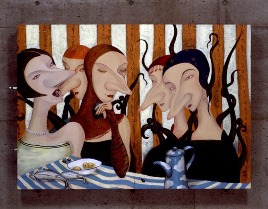 It is in the paintings that one finds the most acute expression of existential pain, which is linked to the longing for the beautiful and with a feeling of abnormality. Always the same women, forever sitting round a table. Always huge noses, like Cyrano de Bergerac. What looks like a relaxed, stylized tea-party induces nervousness and unease. Or, perhaps, as Oscar Wilde said: “No object is so ugly that, under certain conditions of light and shades, or proximity to other things, it will not look beautiful; no object is so beautiful that, under certain conditions, it will not look ugly. I believe that in every twenty-four hours what is beautiful looks ugly, and what is ugly looks beautiful, once.” (Oscar Wilde, Lecture to Art Students, 7 Arts, Falcon’s Wing Press, Colorado, 1955).