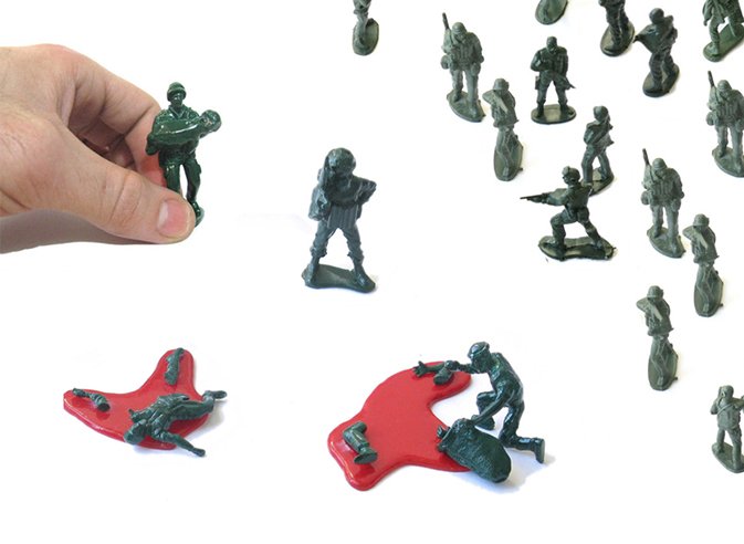 Shahar Kagan inspected an entirely different aspect of everyday life in Israel. The image of soldiers walking around the streets with riffles is a common sight for us Israelis. Images of rock throwers, bombing casualties and coffins have become daily matters for the people who live in Israel. Kagan chose to design plastic toy soldiers which can be an Israeli addition to the popular kids game. In his work, each figure took on a different interpretation and has its own tragic role.