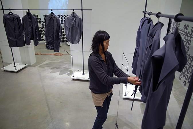 Mechanical Couture – Fashioning a New Order, deals with the interrelationship between couture and machines. The combination of these two words will generally bring to mind instant images of the huge factories evoked by the triple-word phrase “Made in China”; three words that are usually received with disdain and indignation about inferior quality, harsh working conditions, mass production, and the absence of originality. But once in a while, this combination produces different and wondrous things; garments that could not have been produced other than by means of this combination of machines and couture. Such are the garments designed by Ying Gao, which are on display in the exhibition.I met Ying Gao, whose garments take up about half the space of the Museum’s Lower Gallery, for coffee at the Museum two days before the opening of the exhibition. She was born in Beijing in 1974, her father was a diplomat, and she lived in various countries around the world. She studied fashion design in Geneva and Montreal. After working for a while in the fashion industry, she realized that this was not where she belonged, and decided to continue her studies. She was awarded her MA in Interactive Media from Université du Québec à Montréal, where she is currently a professor at the Graduate School of Fashion Design. A surprising shift, one might think, but according to Gao, there was nothing more natural for her. “I have always had a tendency for media,” she states modestly.