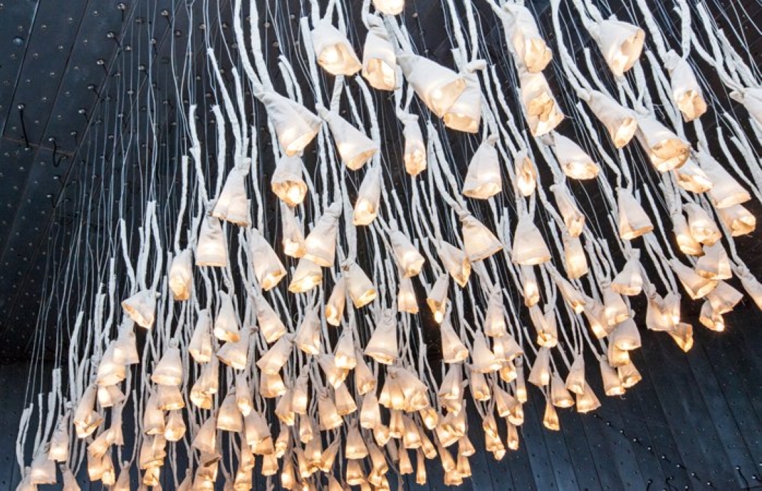 The result is a light space made from electricity-conducting metal sheets, dotted in a repetitive pattern of metal snaps, suspended from which are clusters of soft fabric lamps that seem to be huddling together to strengthen and intensify their power.