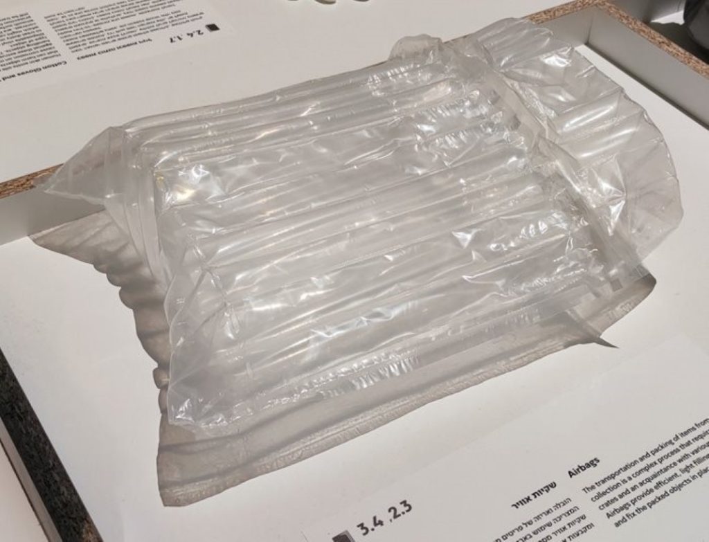 The real magic of polyurethane foam is not its efficiency in protecting packaged goods, but rather the surprising visible change it undergoes due to the chemical reaction created by the combination of two different components. This chemical reaction causes the material to foam up to more than ten times its original liquid volume, expanding and trapping air bubbles in the process. During its rapid expansion the Instapak bag fills the gaps between the storage box and the object nestled in it. When the material solidifies, it becomes a negative image of the object around which it expanded, perhaps even outliving the object itself.