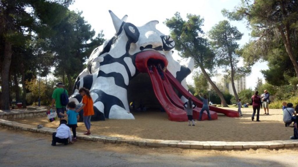 It is hard to measure the needed balance between fun and safety. A classic example for a balanced approach is the “Mifletzet” (Monster Park) mentioned above. This play-scape (originally named “The Golem”) was designed by Niki Saint Phalle and constructed between the years 1971-1972. This large statue has only three slides protruding from the monster’s mouth (the swings in its belly had been removed decades years ago).