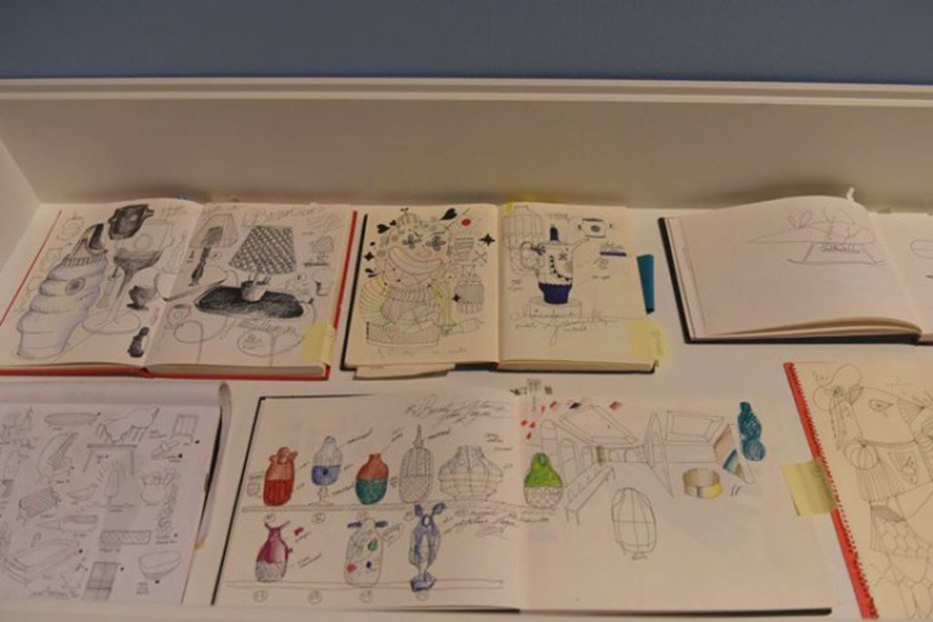 Drawings and their inherent narratives form the core of Jaime’s work. ‘Most of all, he would love to do this all the time’, Nienke confides. Jaime draws everywhere and continually, as is shown by the enormous stack of sketchbooks, some of which will also be on show in the exhibition. During one of the visits to his studio in Valencia, we browsed through these books. The earliest sketchbooks date from 1997 and resemble agendas or diaries in which every scrap of space has been occupied by glued-in photos of friends and all kinds of pictures and memorabilia, occasionally elaborated with his graffiti-like doodles. There is also a snapshot of a party at which pop celebrity Peter Gabriel is dancing with designer Philip Starck, and a business card of the then relatively unknown chef de cuisine Ferran Adrià. All kinds of images of cactuses and Michelin-like figures can also be discerned, elements that are later assigned a place in his first autonomous work. It is a cacophony of ideas, bizarre figures, jokes, stories and loose ends, events and fantasies. Subsequent sketchbooks have a larger format in which the drawings, now clearer and more elaborated, are grouped around a concrete project.