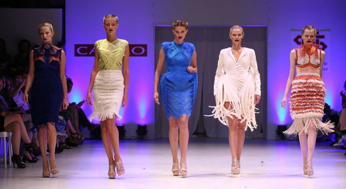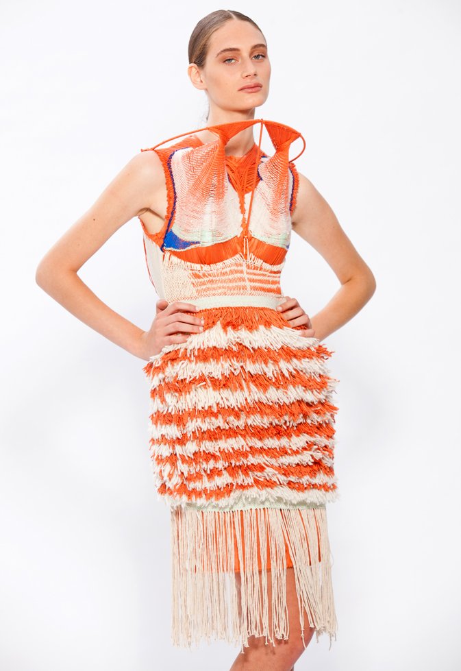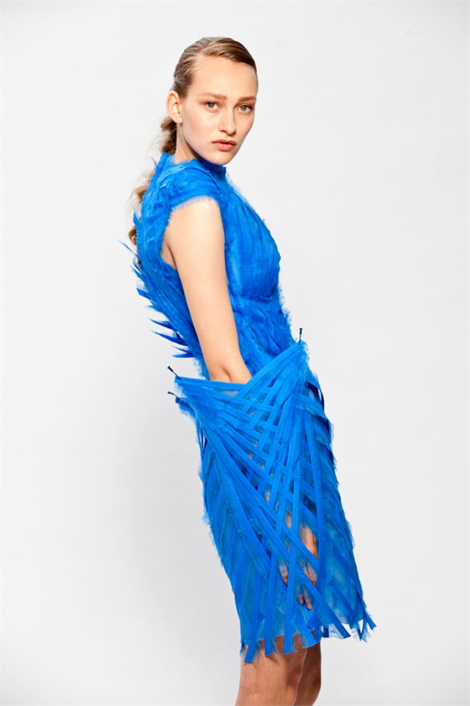Another graduate who employs weaving and a very similar color palette is Mark Goldenberg from the Department of Fashion Design at Shenkar College of Engineering and Design. Goldenberg presented a delicate and fascinating collection inspired by artist Naum Gabo (click here for further information about the artist), entitled Woven Bird, for which he received the DVF Award for Best Collection, and won an internship at the New York City studio of Diane von Furstenberg.