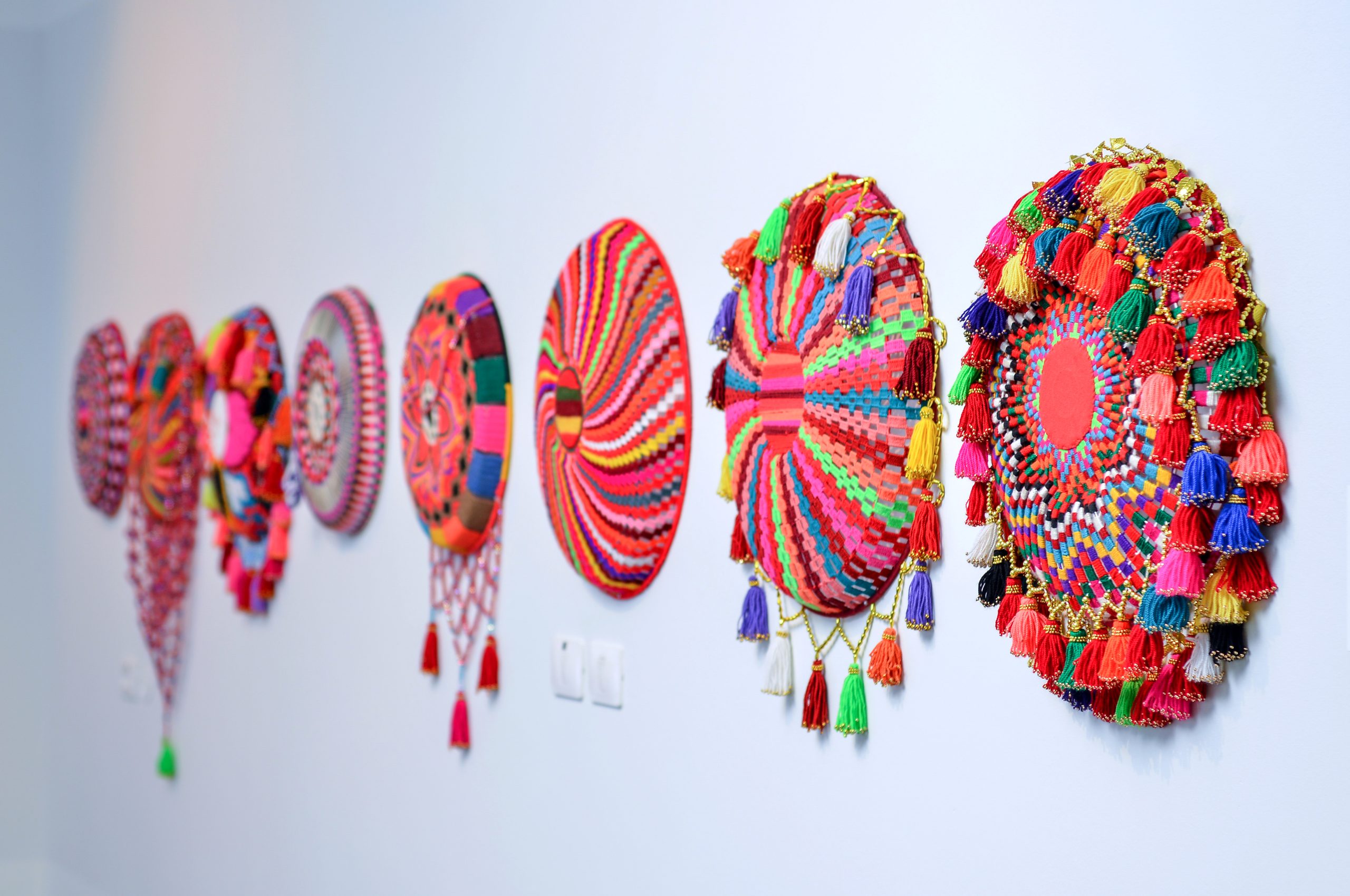 Most of the items are based on reusing household objects and discarded objects, such as fan covers, plastic containers, clothes hangers, irrigation pipes, and tin cans. Most of them serve as a basis which is then completely covered with threads, weaving, embroidery, and sewing decorations, and more recently secular and religious texts are also incorporated into them. Use of elements from the traditions of the past is clearly evident in the pieces, and we can see the threads of the past interwoven into the new objects that reflect Bedouin life in the present.